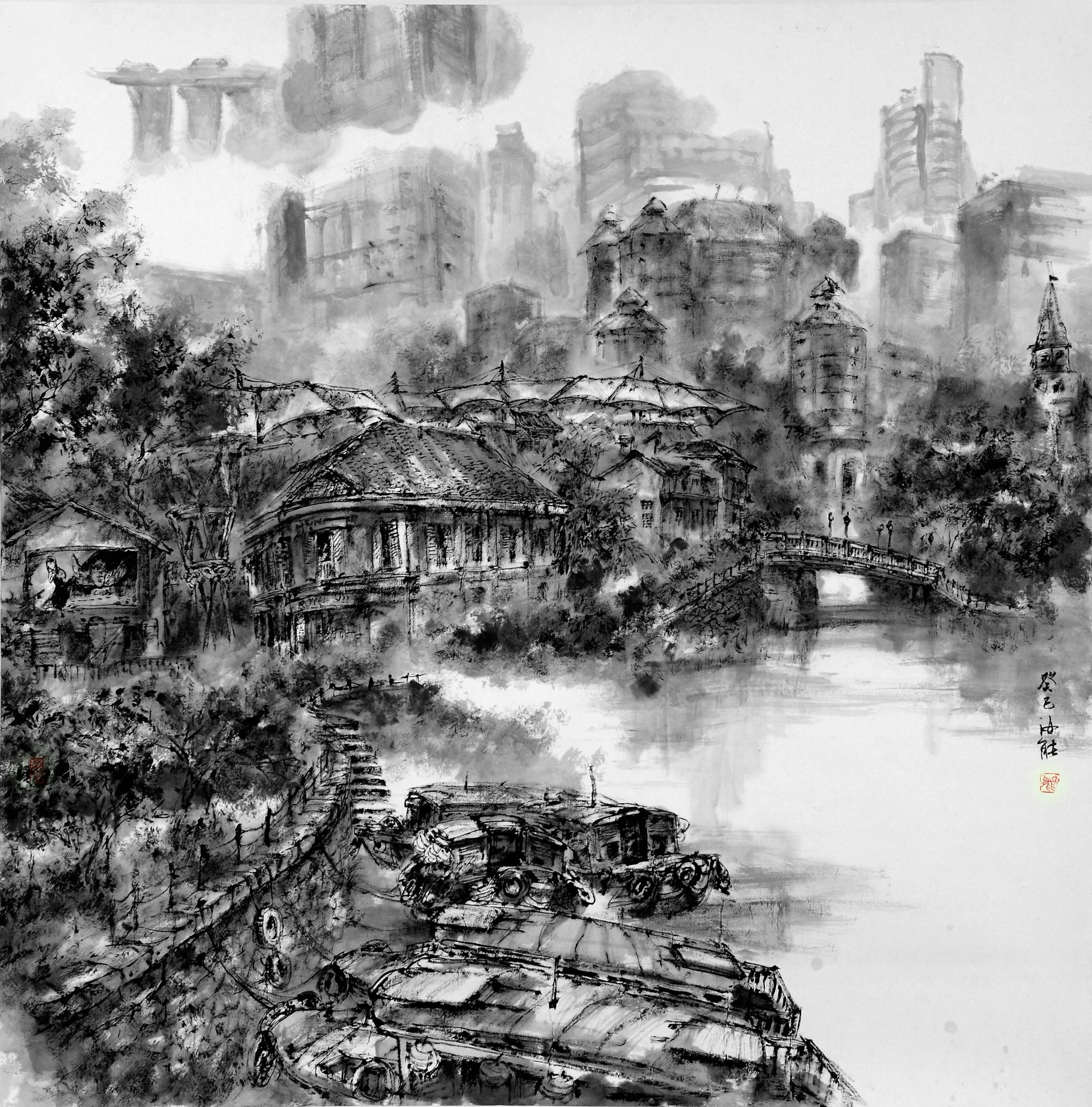 These creations which are filled with numerous details reflect the artist’s mastery of the ink medium and fine observation skills as he paints on site. With the illustration of shophouses and modern buildings in Tung Yue Nang compositions, his paintings have become artistic records of the urban landscape in Singapore. With the inclusion of passersby going about different activities, his paintings have also become a unique documentation of life in this country.