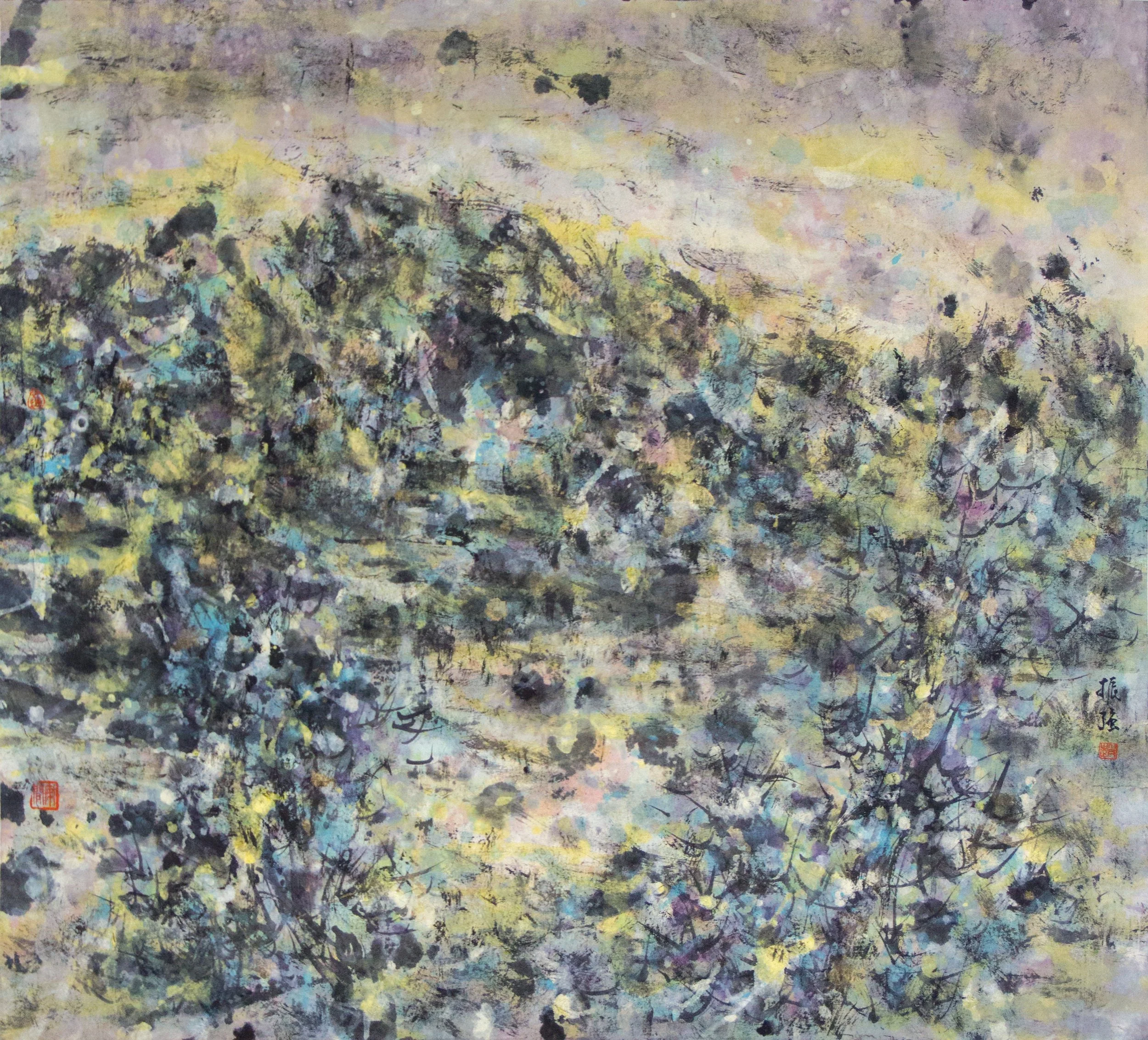 Terence Teo is known for applying an array of colours that represent leaves and flowers over darker ink lines that forge the trunk, branches and twigs of trees. He invites the viewer to imagine being in nature, to hear the sounds of flowing water and the chirping birds while enjoying his paintings.