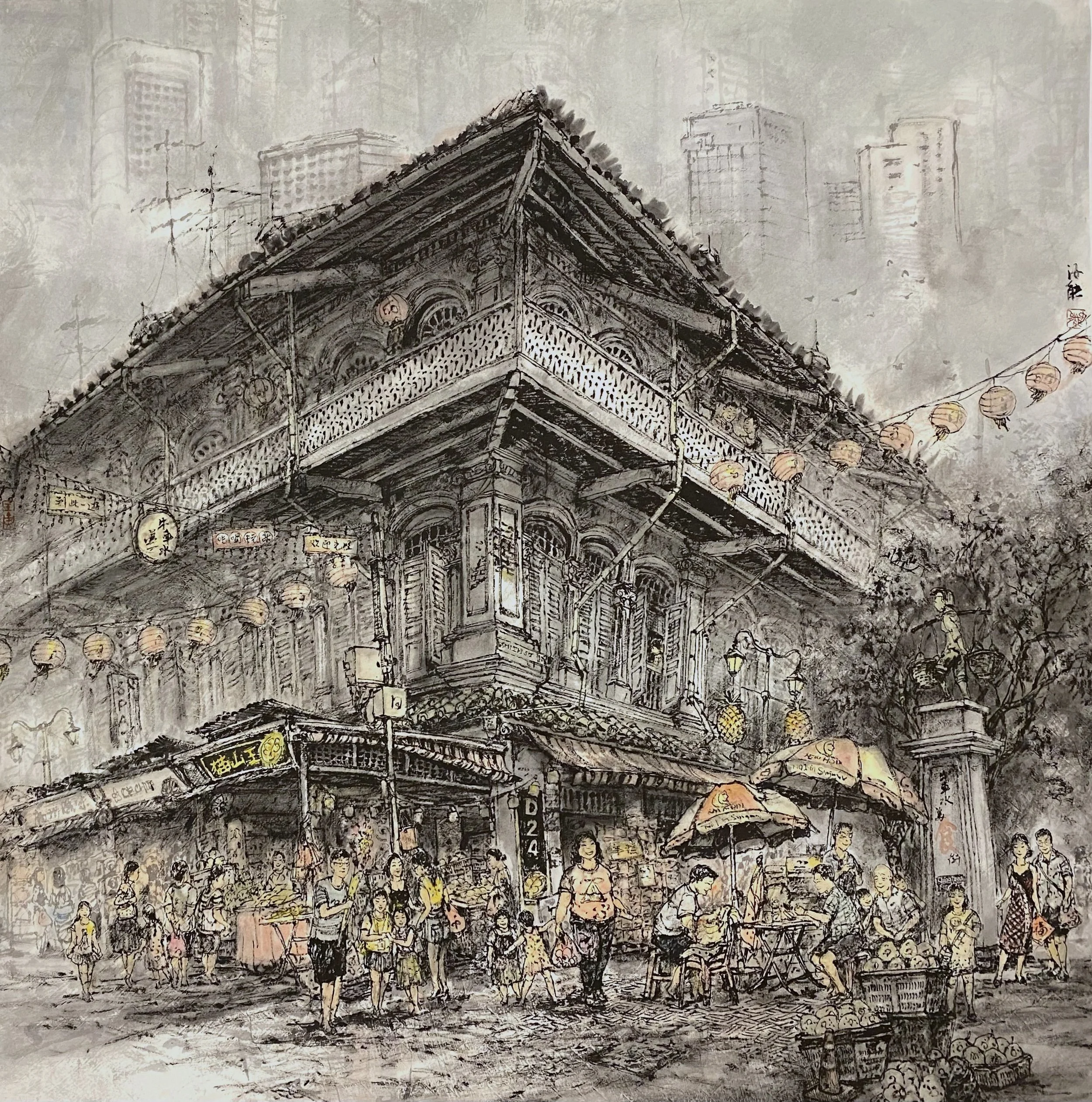 Mr Tung is now known for his ink paintings of iconic places such as Singapore River, Joo Chiat, Pulau Ubin and Chinatown. He managed to create a nice historical ambience in his paintings by focusing on the largely monochrome characteristic in his works. These paintings are also very detailed. Viewers are able to appreciate the passersby’s expressions, the clothing that they are wearing, the goods displayed at the shopfronts as well as the details on the buildings.
