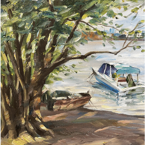 This paintings displays dabs of colours coming together to form the impression of scenery at West Coast Park.