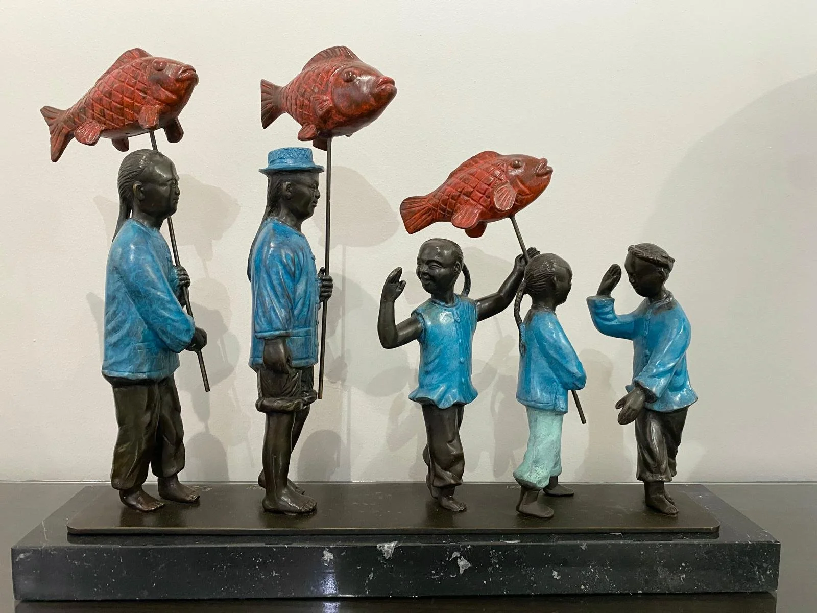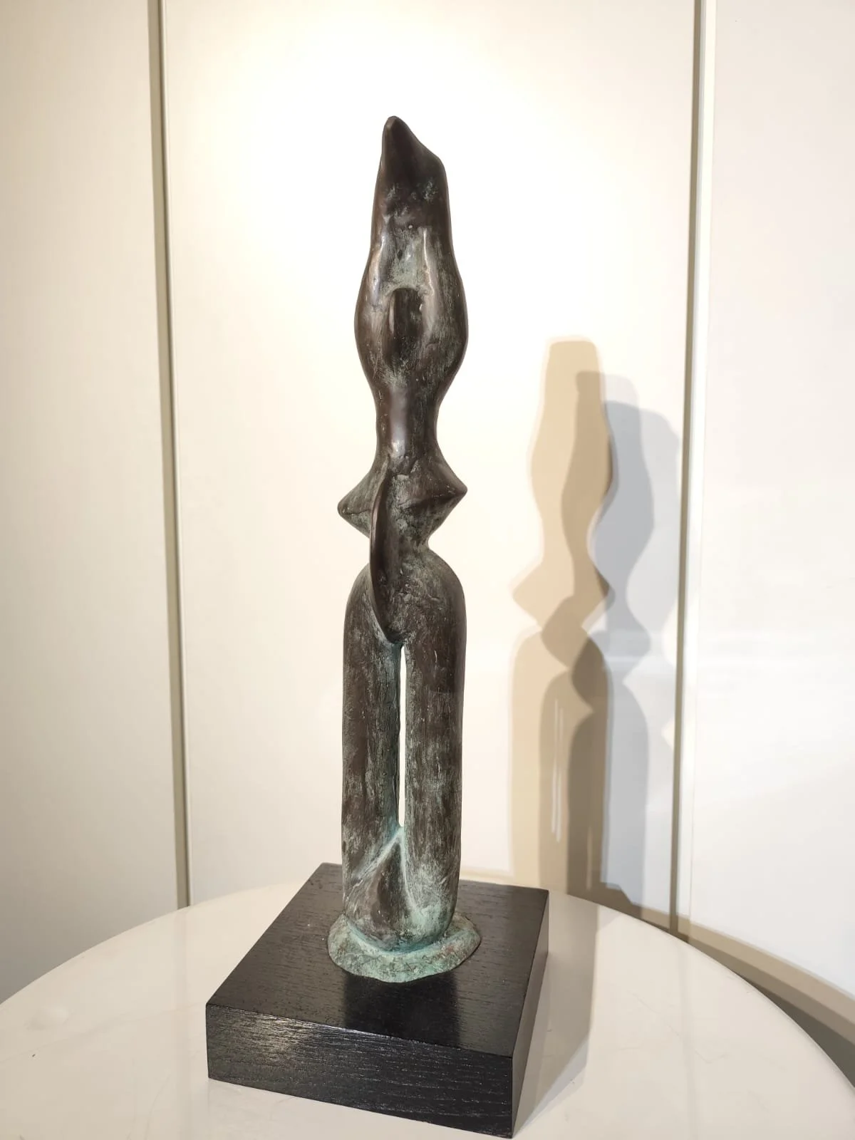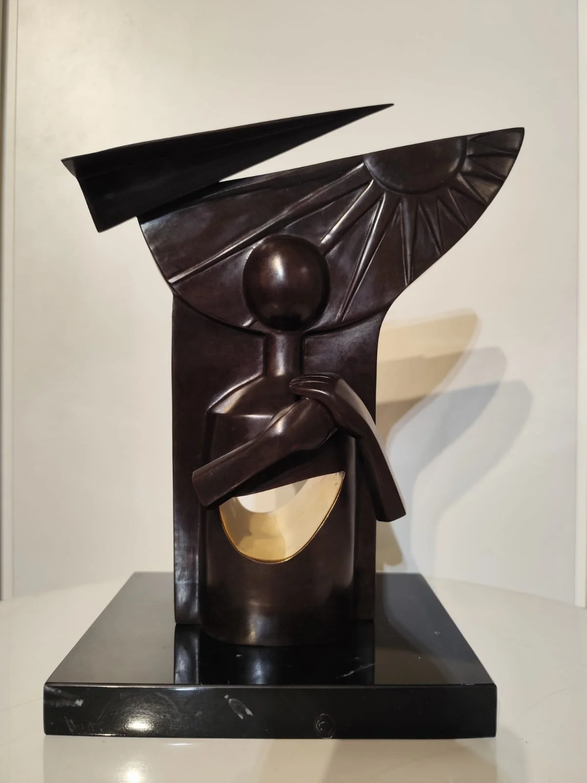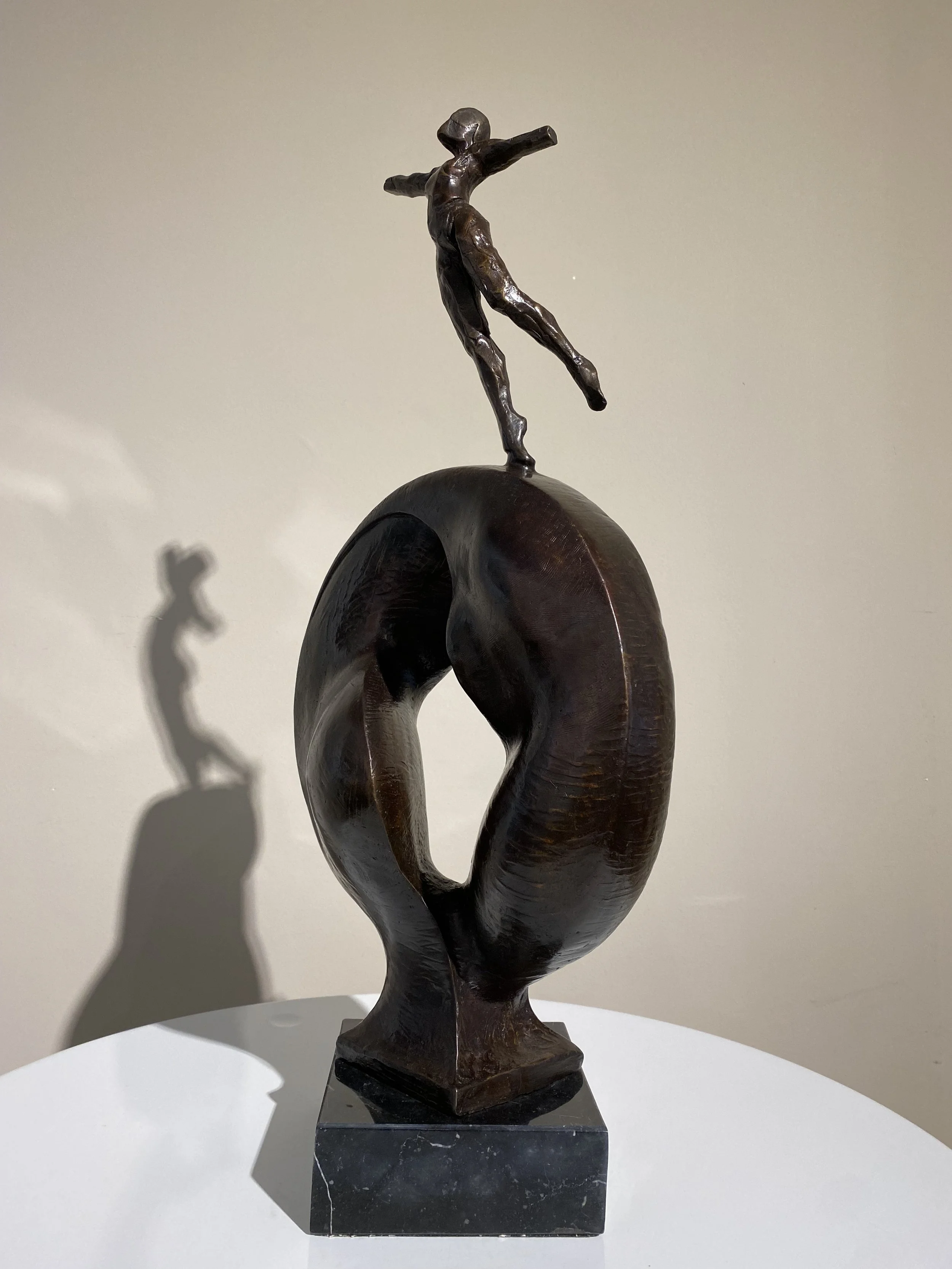The interplay of light on the bronze surface adds a dynamic visual layer, enhancing the sculpture’s depth and presence.