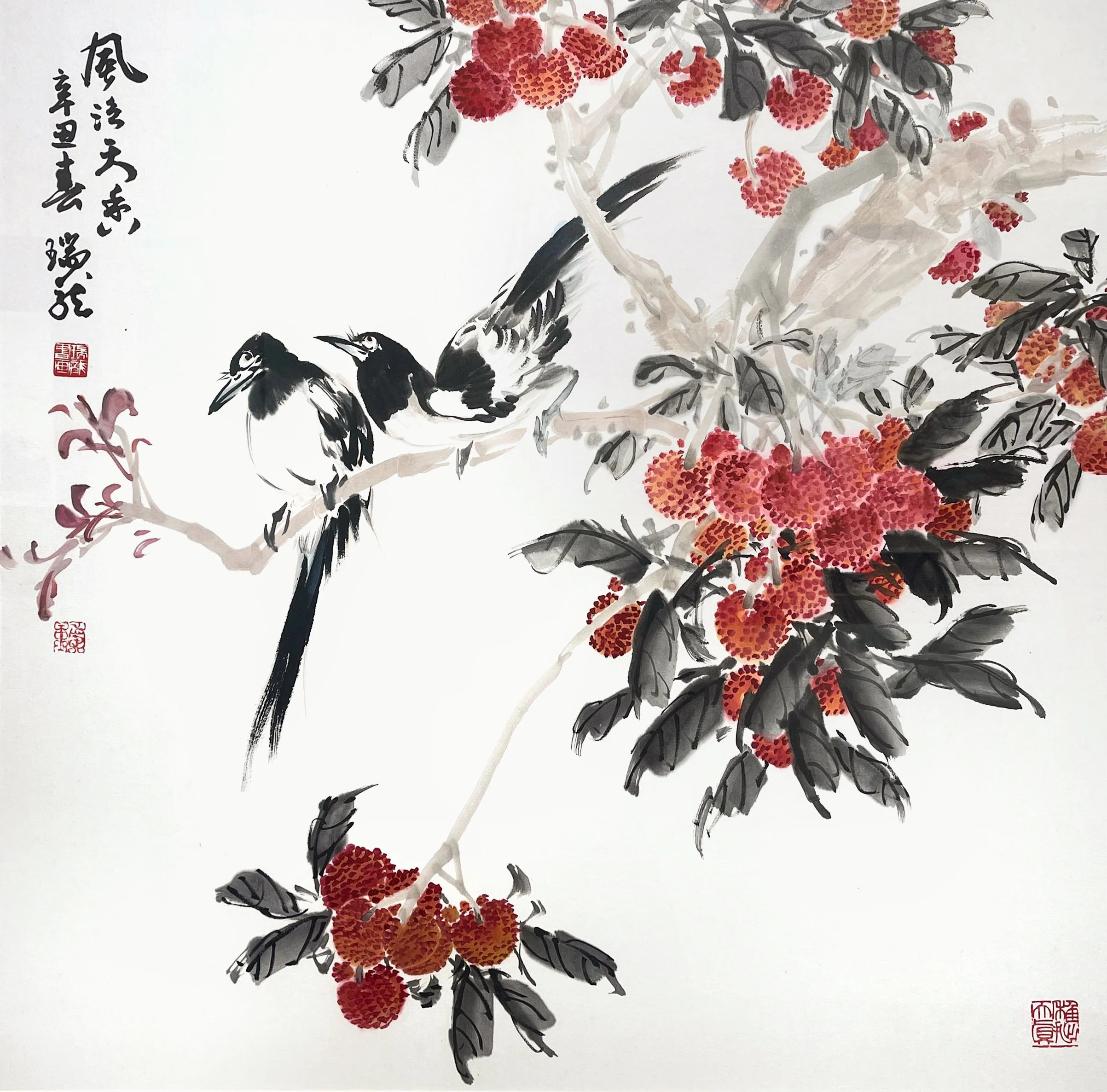 With confident brushstrokes and beautiful composition, 74 year old Singaporean ink master Nai Swee Leng creates a beautiful painting of a pair of Magpies and Lychees.