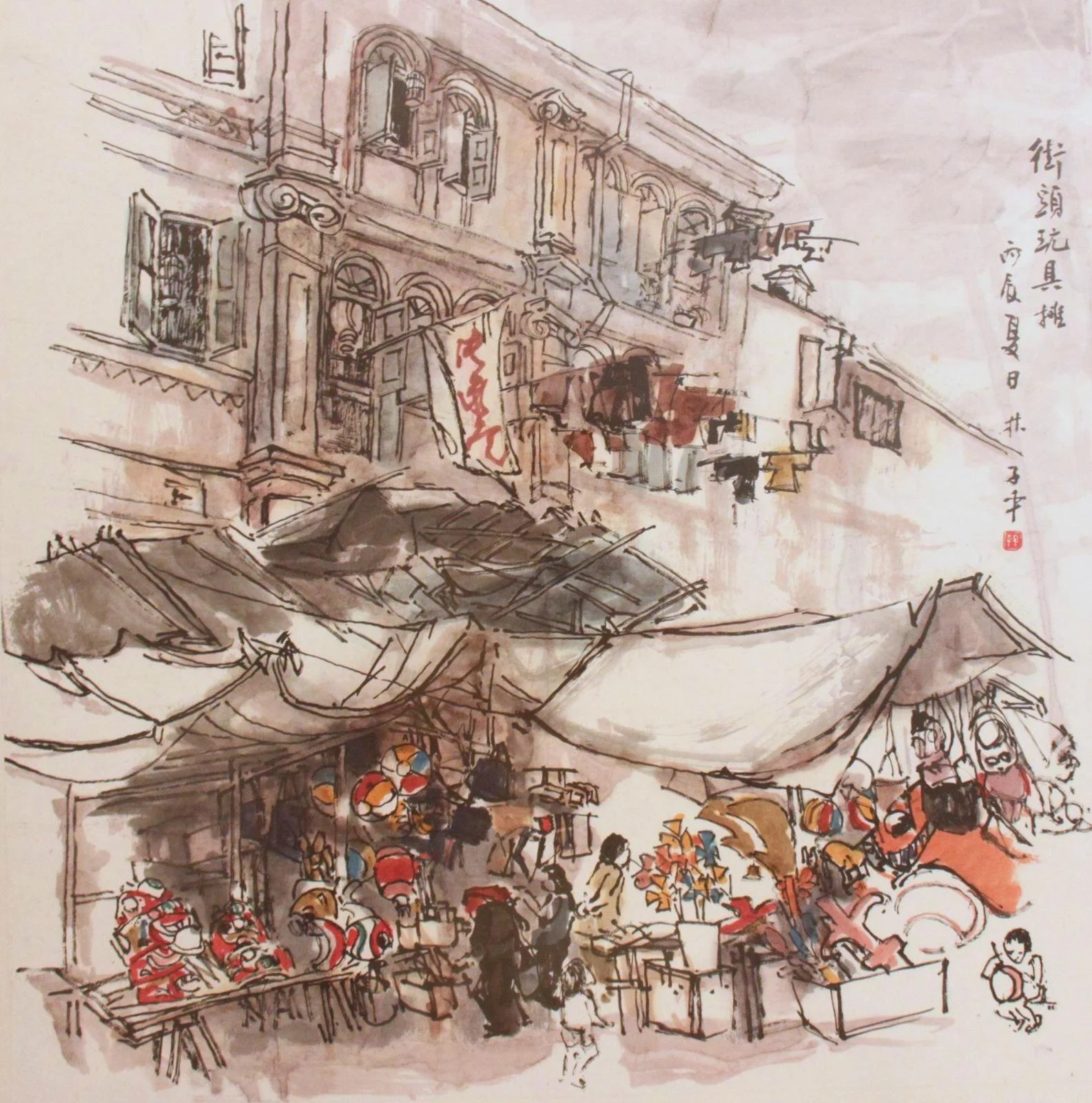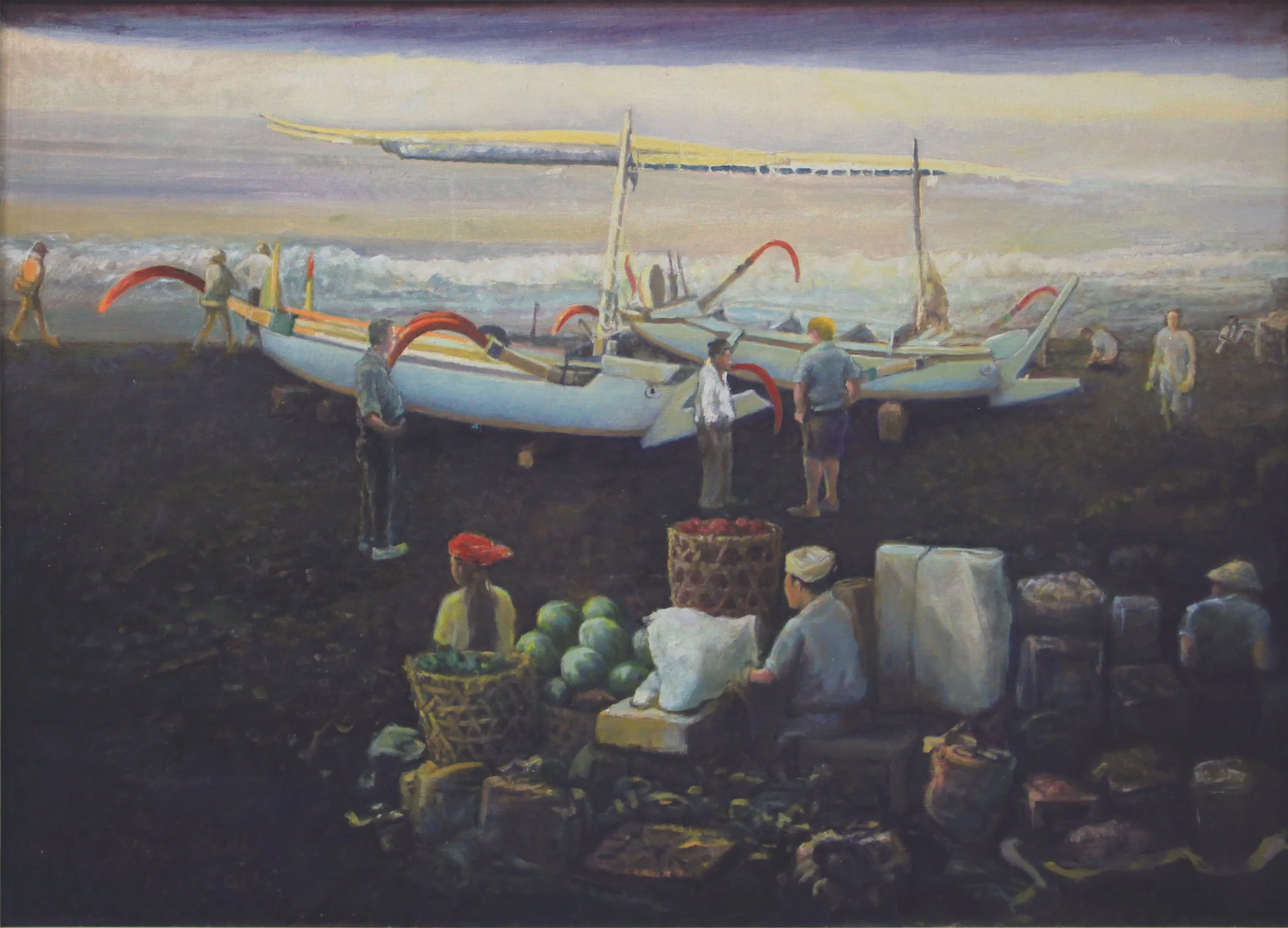 This painting beautifully captures the vibrant energy of daily life along the beach, with fruit vendors sitting by the clear waters, their baskets filled with fresh harvest. White boats are docked along the shore, and people are seen going about their routines, creating a lively yet tranquil scene. Lim Yew Kuan’s expressive brushstrokes and rich colours convey the warmth and harmony of the coastal setting, offering a peaceful glimpse into the daily rhythms of life by the sea.