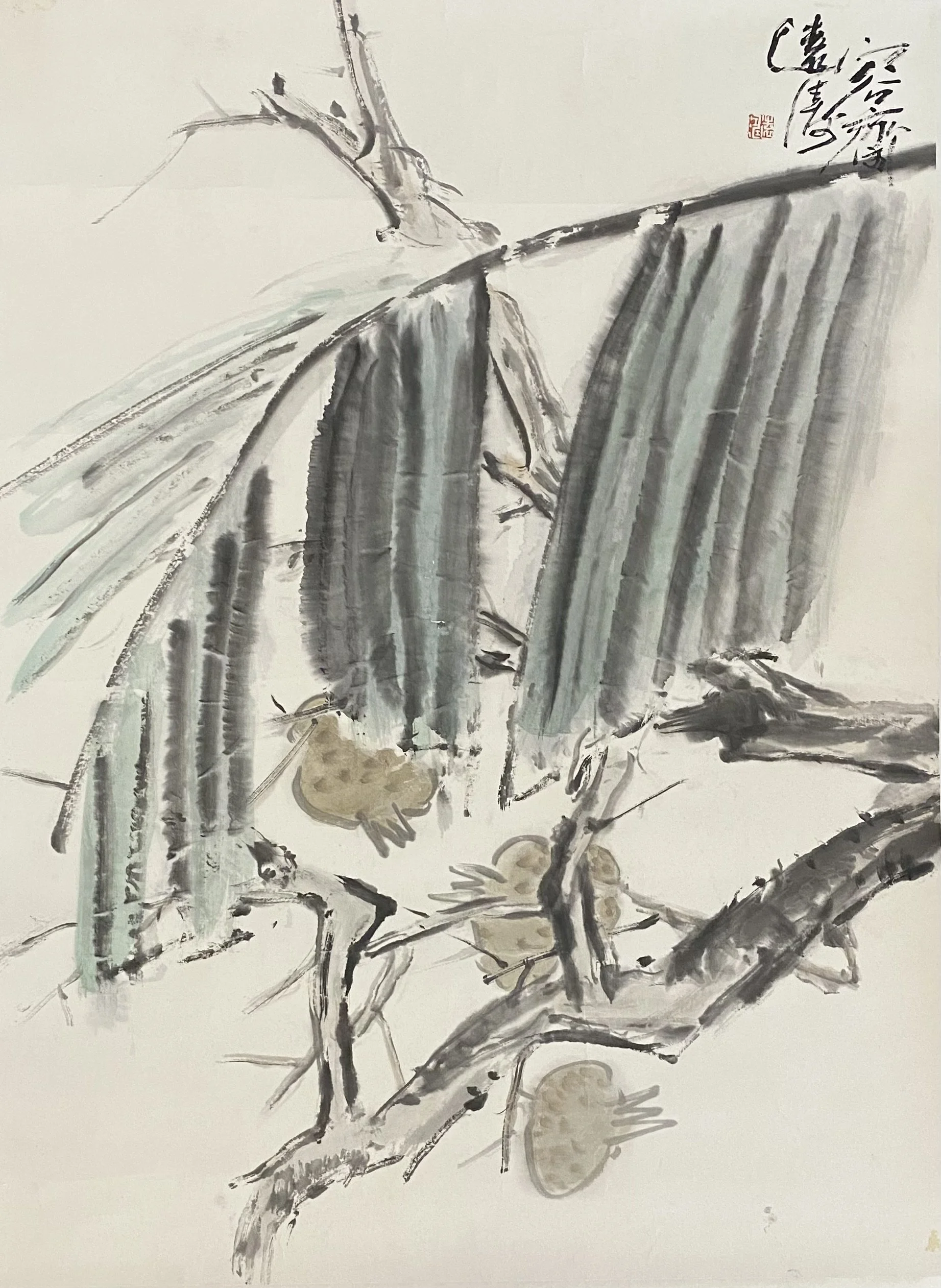 The painting showcases a serene composition with long, flowing banana leaves (芭蕉叶) hanging gracefully, complemented by the soft, rounded shapes of pomegranates (石榴) nestled among branches. The artist uses a muted colour palette, with pale greens and soft browns, creating a sense of tranquility. The brushwork is expressive yet subtle, capturing the natural beauty of the plants while maintaining an air of simplicity and elegance. The piece evokes a quiet, contemplative atmosphere, celebrating the harmony of nature.