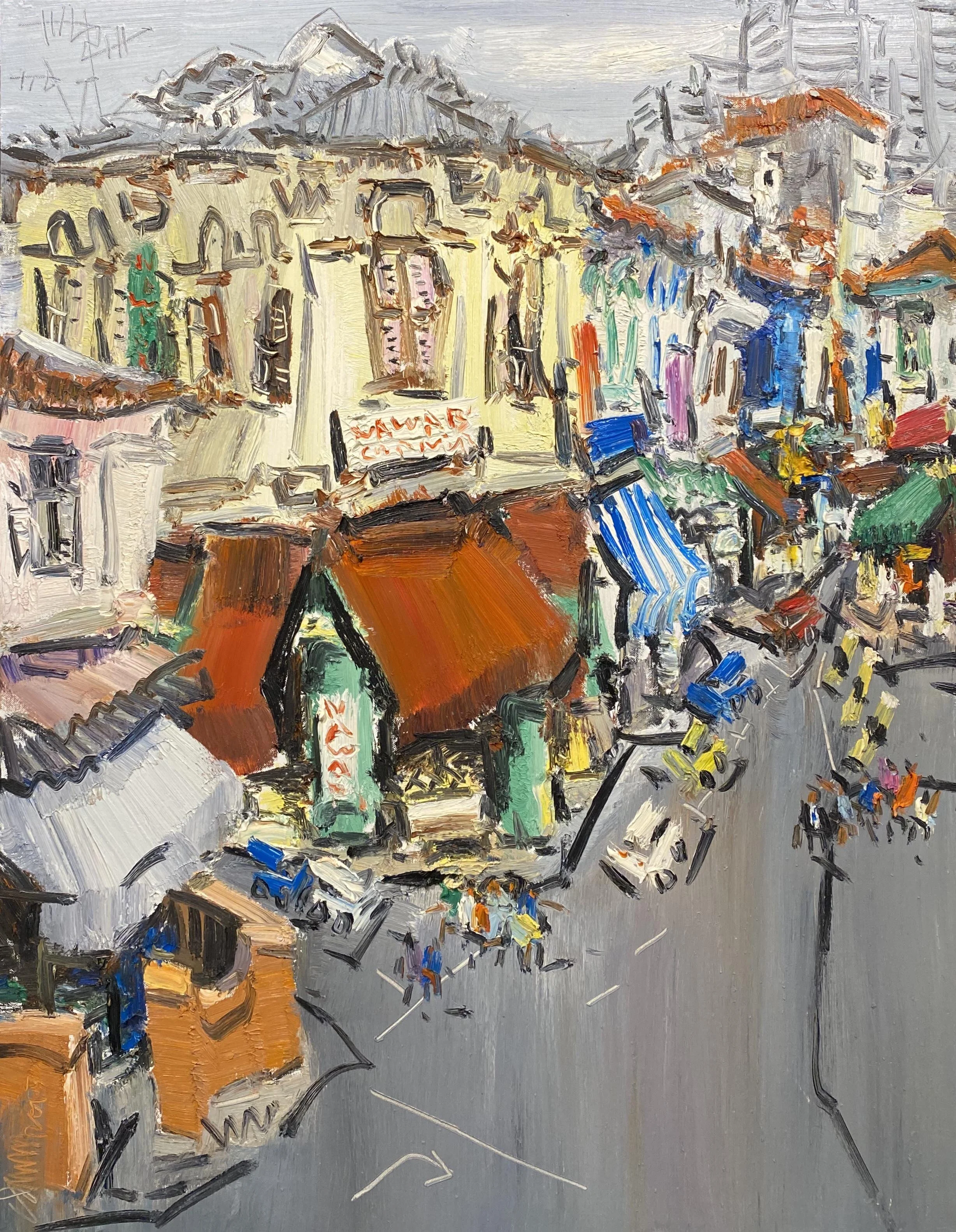 Zhu Hong first started painting at Little India, To him, it is a place that is filled with energy, life and colourful shophouses. He derives his inspiration from the vibrant atmosphere of the place, expressing his observations and feelings with energetic strokes of the brush on canvas. Zhu Hong rarely paints vertical compositions which makes this piece special.