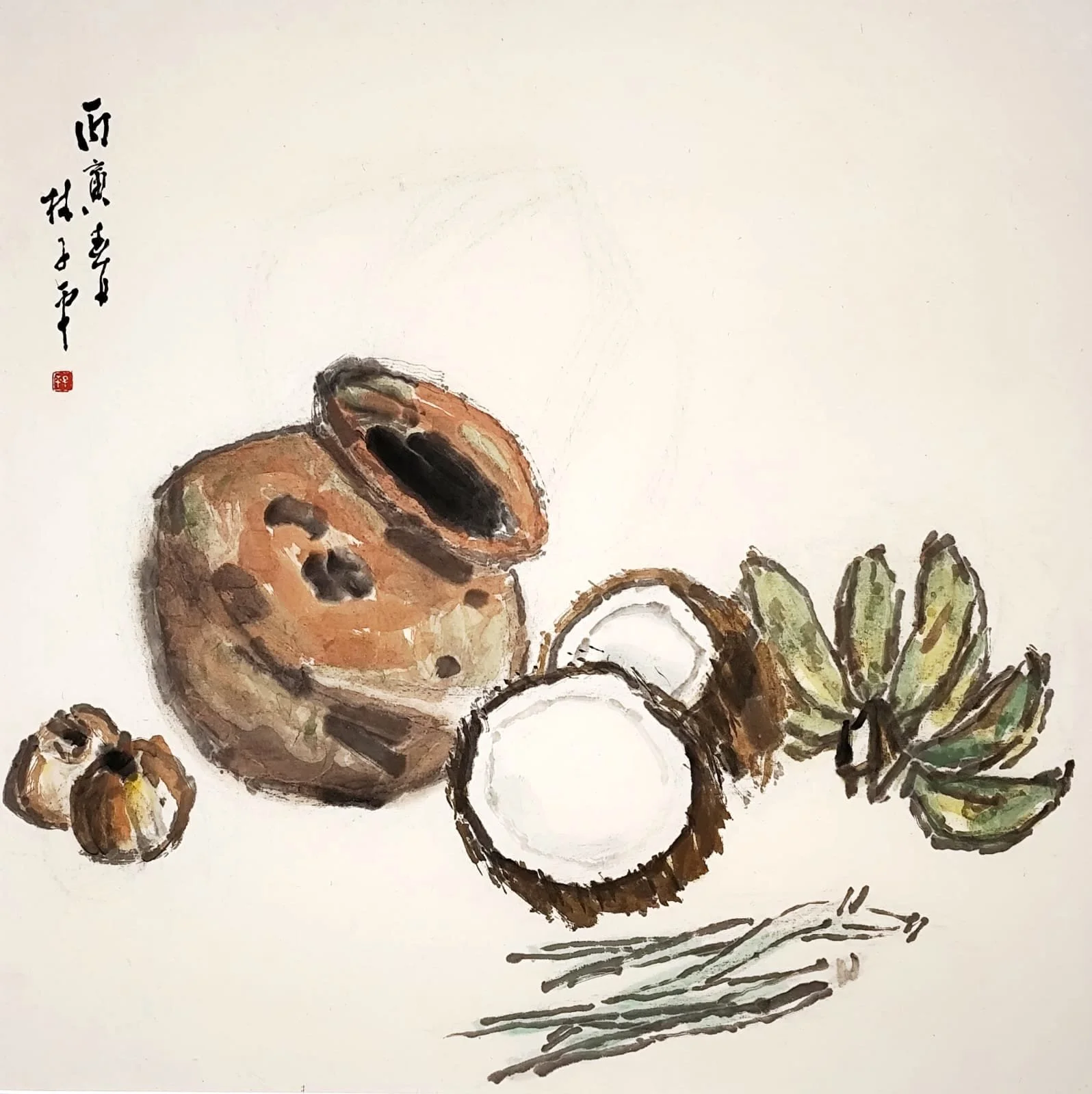 This ink painting by Chua Ek Kay uniquely blends nature and architecture, featuring two vibrant pomegranate fruits in the foreground against a backdrop of iconic blue shophouse windows. Unlike his typical works, which focus on plants or street scenes, this piece fuses both elements, offering a close-up perspective that highlights the harmony between nature and urban life. The vivid pinkish-red pomegranates stand in stark contrast to the serene, architectural backdrop, creating a striking balance of form and color.