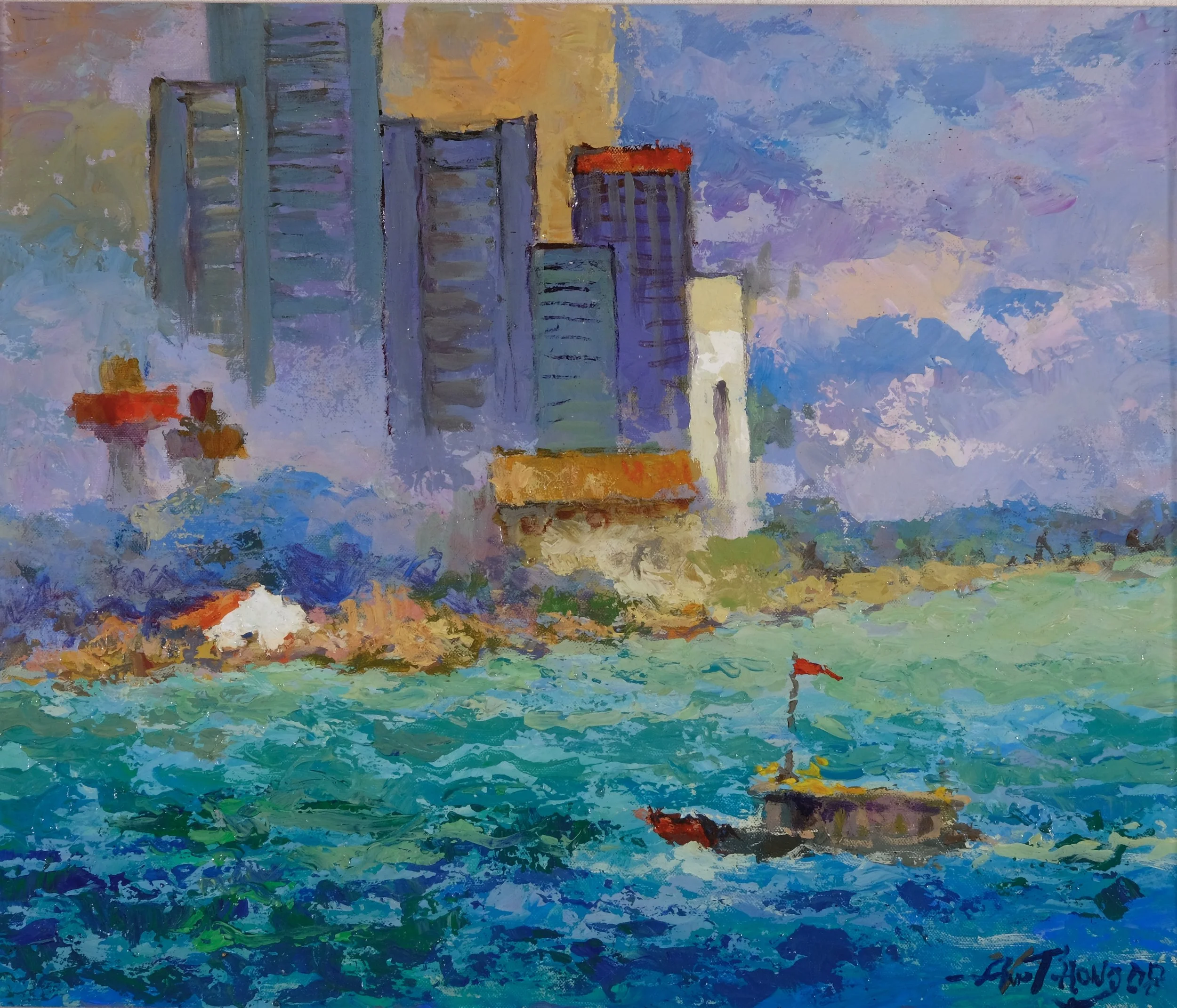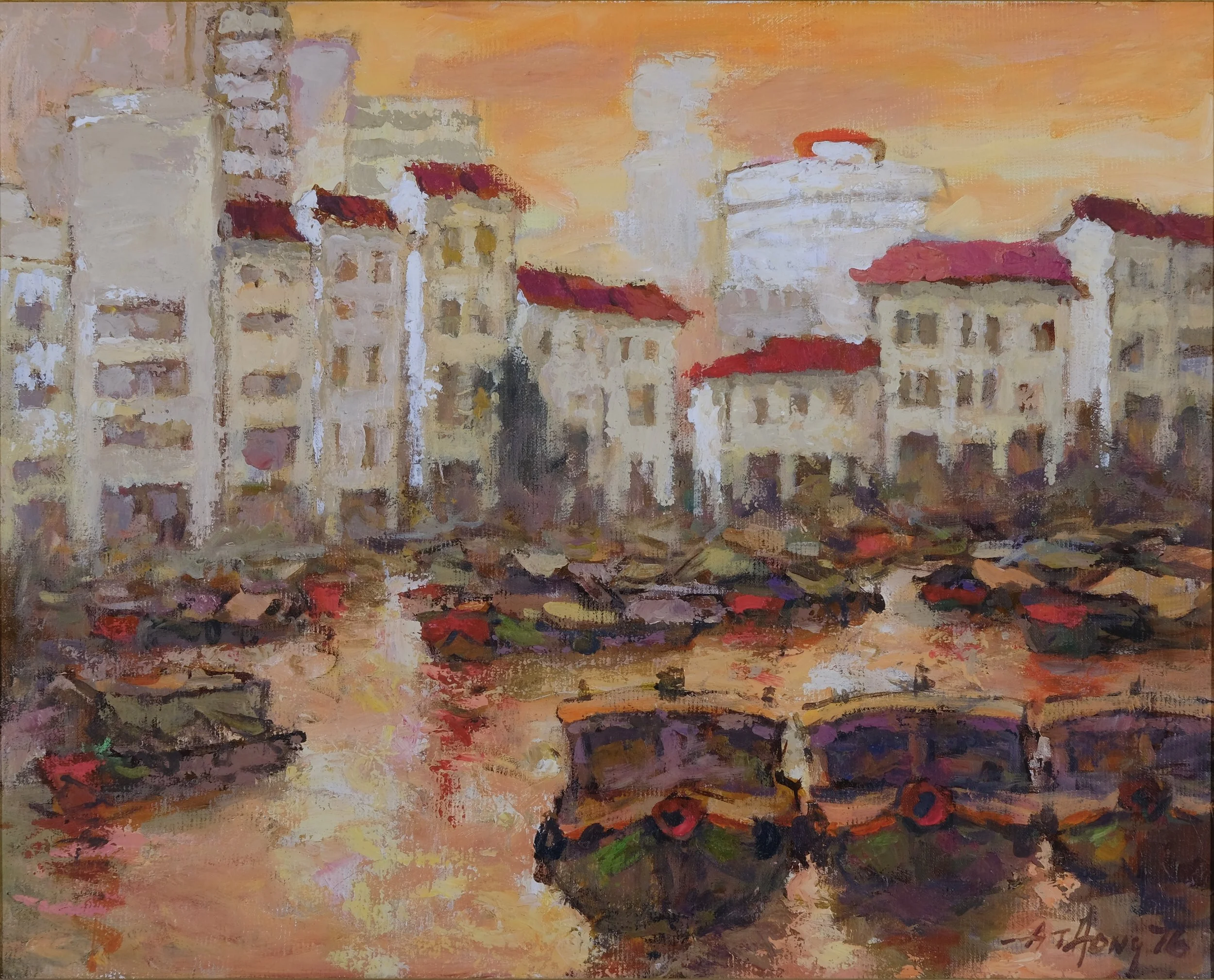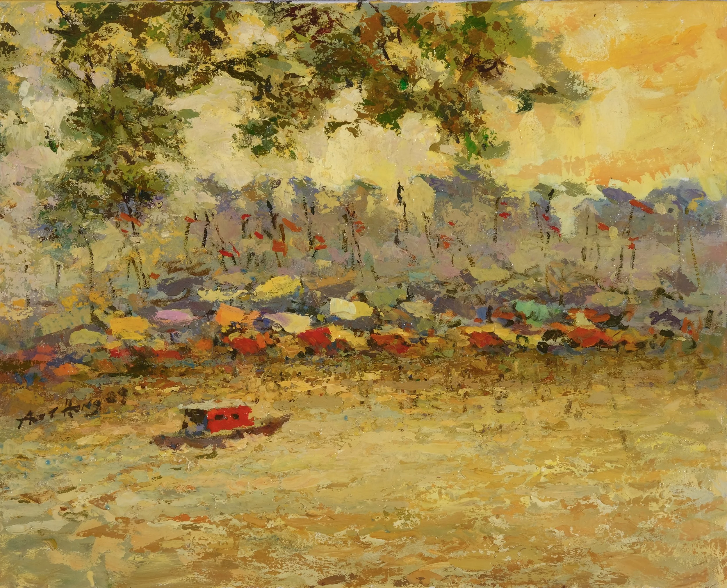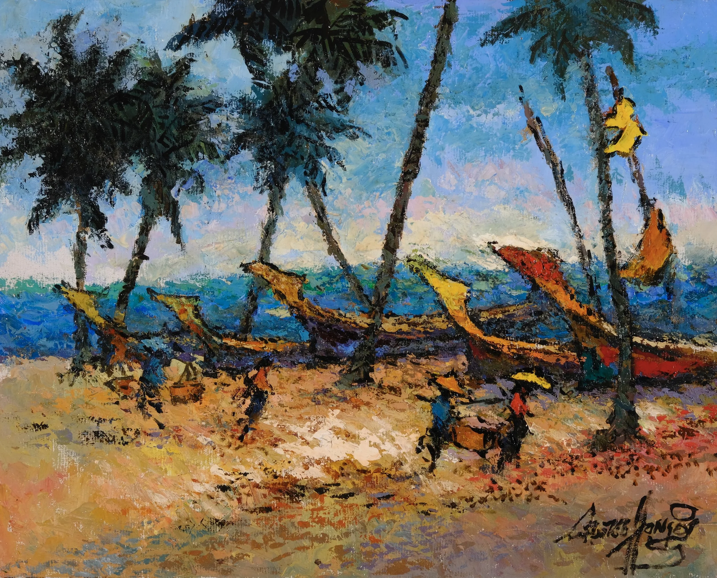 This painting beautifully captures the vibrant energy of daily life along the beach, with fruit vendors sitting by the clear waters, their baskets filled with fresh harvest. White boats are docked along the shore, and people are seen going about their routines, creating a lively yet tranquil scene. Lim Yew Kuan’s expressive brushstrokes and rich colours convey the warmth and harmony of the coastal setting, offering a peaceful glimpse into the daily rhythms of life by the sea.