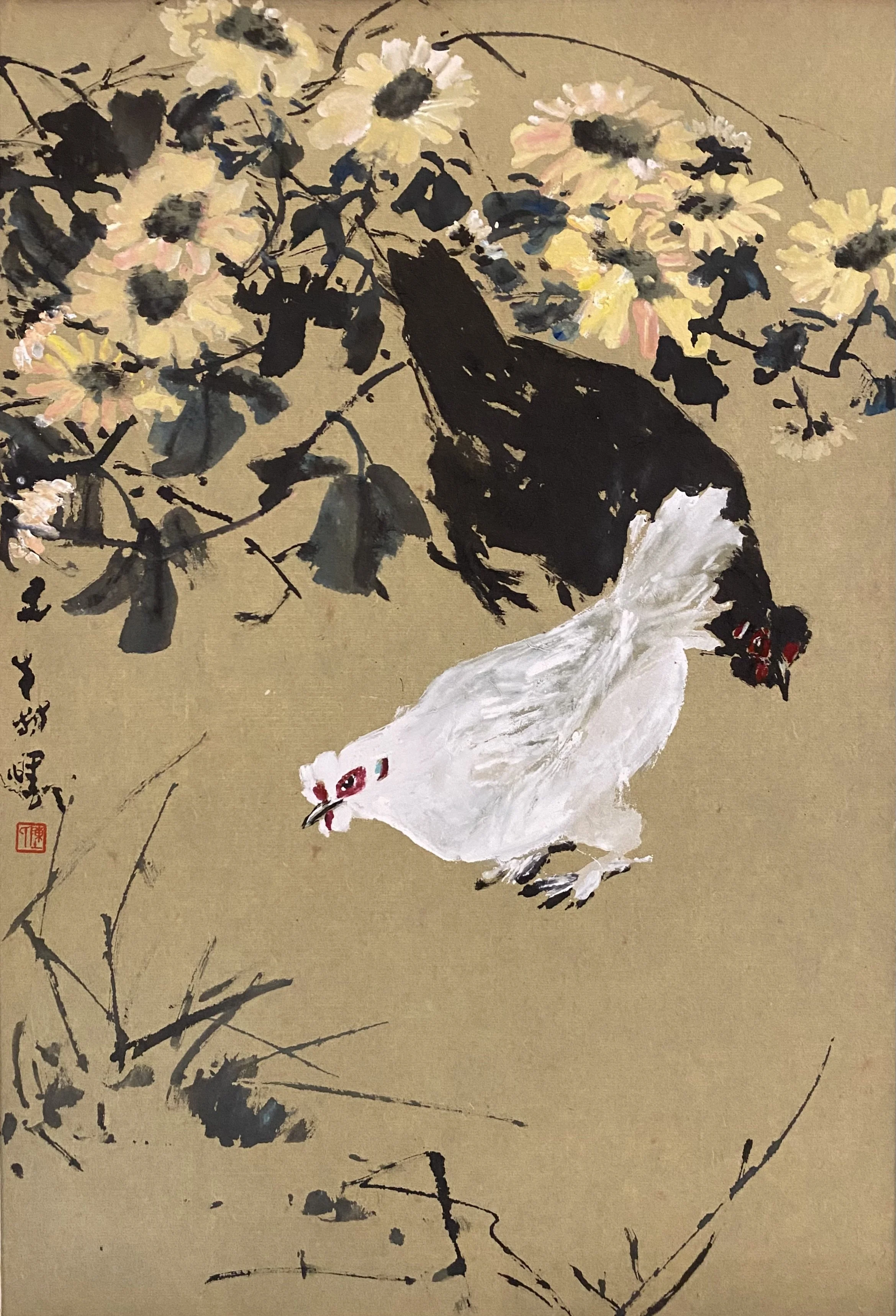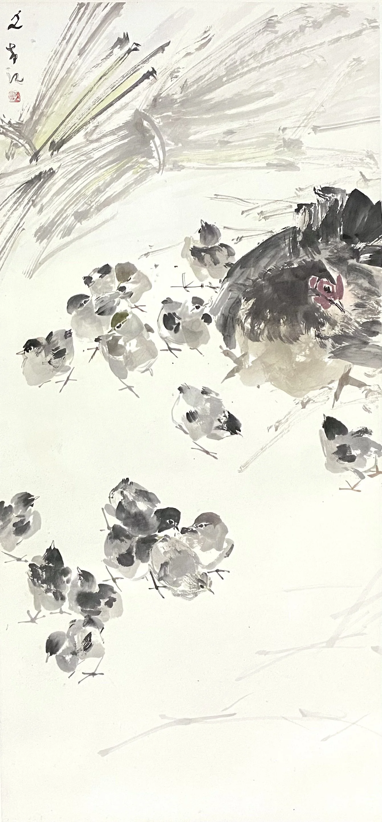 Chen Wen Hsi’s finger painting technique, characterised by its bold, direct application of ink, captures the vitality and spontaneity of his subjects with a unique, tactile energy. In Chinese culture, chickens symbolise vitality, prosperity, and good fortune, often associated with the arrival of a new day, making them a fitting subject for Chen’s exploration of opposites and balance in life.
